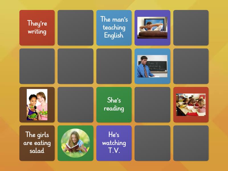 She's reading, He's watching T.V., They're writing, The man's teaching English, The girls are eating salad, The baby's sleeping, The women are drinking wine, The kids are playing in the park, The baby's smiling, The cat's waliking,