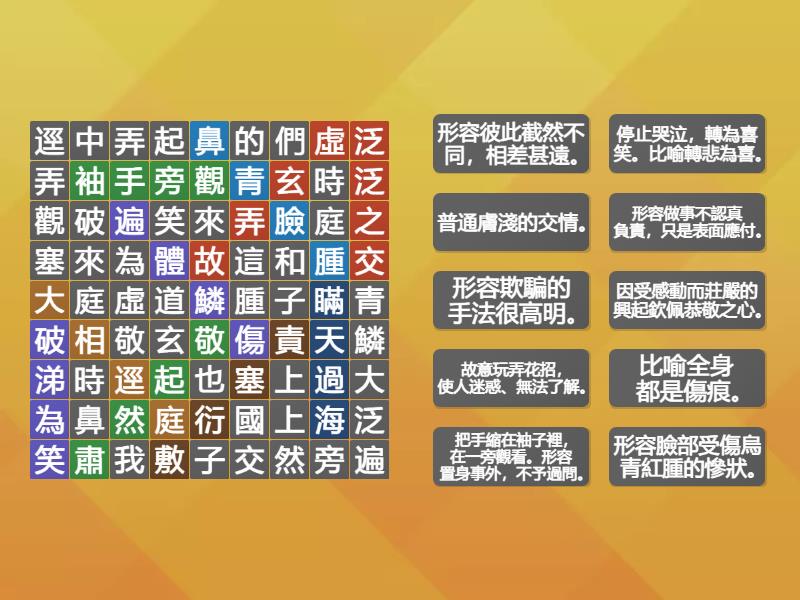 肅然起敬 - 因受感動而莊嚴的 興起欽佩恭敬之心。, 遍體鱗傷 - 比喻全身 都是傷痕。, 故弄玄虛 - 故意玩弄花招, 使人迷惑、無法了解。, 鼻青臉腫 - 形容臉部受傷烏 青紅腫的慘狀。, 敷衍塞責 - 形容做事不認真 負責,只是表面應付。, 瞞天過海 - 形容欺騙的 手法很高明。, 大相逕庭 - 形容彼此截然不 同,相差甚遠。, 袖手旁觀 - 把手縮在袖子裡, 在一旁觀看。形容 置身事外,不予過問。, 破涕為笑 - 停止哭泣,轉為喜 笑。比喻轉悲為喜。, 泛泛之交 - 普通膚淺的交情。,