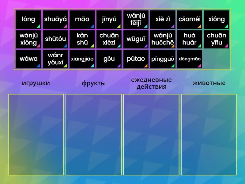 игрушки: wánjù xióng, wánjù fēijī, wánjù huǒchē, wáwa, фрукты: xiāngjiāo, píngguǒ, pútao, cǎoméi, ежедневные действия: xiě zì, kàn shū, huà huàr, wánr yóuxì, shūtóu, shuāyá, chuān yīfu, chuān xiézi, животные: māo, gǒu, wūguī, jīnyú, xióngmāo, lóng, xióng,