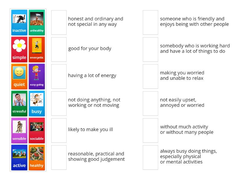 active - always busy doing things, especially physical or mental activities, busy - somebody who is working hard and have a lot of things to do, easy-going - not easily upset, annoyed or worried, enerɡetic - having a lot of energy, healthy - good for your body, inactive - not doing anything, not working or not moving, quiet - without much activity or without many people, sensible - reasonable, practical and showing good judgement, simple - honest and ordinary and not special in any way, sociable - someone who is friendly and enjoys being with other people, stressful - making you worried and unable to relax, unhealthy - likely to make you ill,