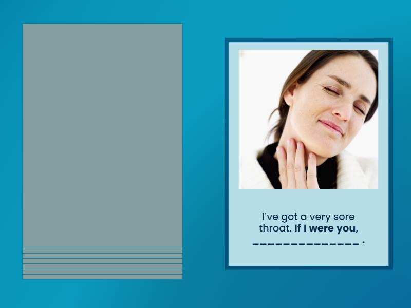 My partner’s extremely rich family doesn’t accept me. Help! If I were you, __________, I’m going to a costume party tonight but don’t have time to go shopping. What could I go as? If I were you, ________________ ., My boss still pronounces my name incorrectly. Shall I say anything? If I were you, ______________ ., My workmates have invited me on a boat trip, but I get sea sick. If I were you, ___________________ ., I’ve noticed my colleague is taking pens from the office home. Shall I say anything? If I were you, _________________ ., I’ve been invited to dinner by my friend’s parents. What shall I take? If I were you, ______________ ., I’ve got a very sore throat. If I were you, ______________ ., I think I waste too much time on the internet. If I were you, ______________..
