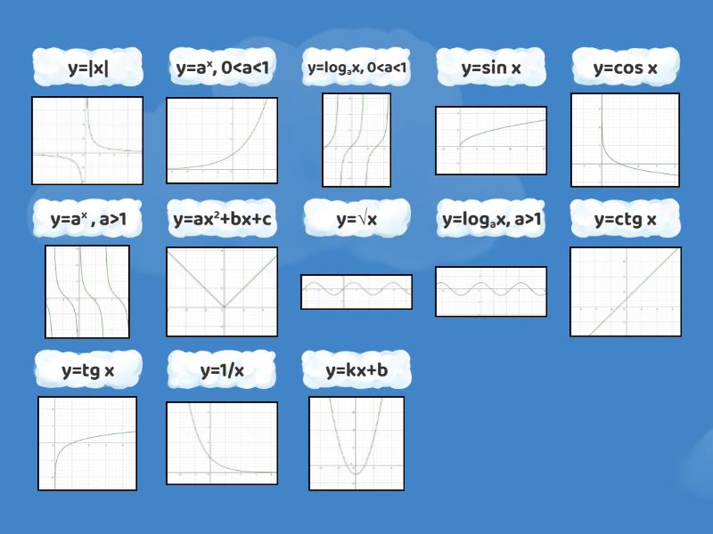 y=kx+b, y=ax2+bx+c, y=1/x, y=ax , a>1, y=ax, 0<a<1, y=|x|, y=√x, y=logax, a>1, y=logax, 0<a<1, y=sin x, y=cos x, y=tg x, y=ctg x,