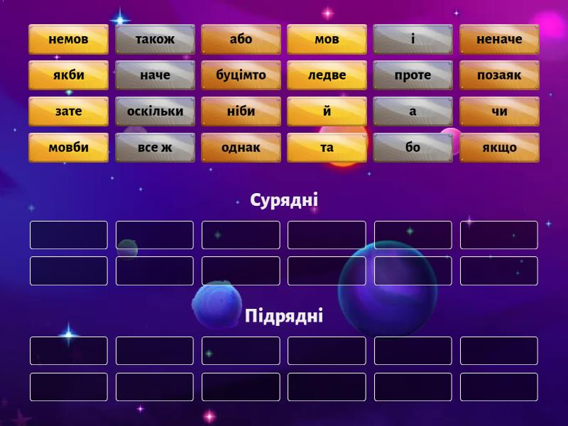 Сурядні: і , та, а, бо, й, зате , проте, однак, все ж, або , чи, також, Підрядні: мов, наче , мовби, немов, неначе, ніби, буцімто, оскільки, позаяк, якщо, якби, ледве,