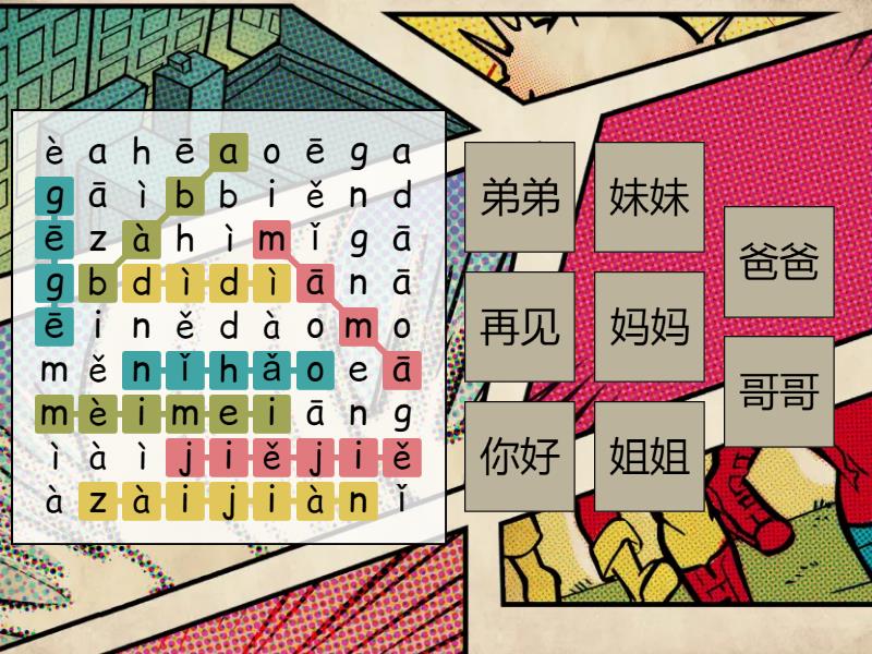 māmā - 妈妈, bàba  - 爸爸, gēgē  - 哥哥, dìdì  - 弟弟, jiějiě  - 姐姐, mèimei  - 妹妹, nǐhǎo - 你好, zàijiàn - 再见,