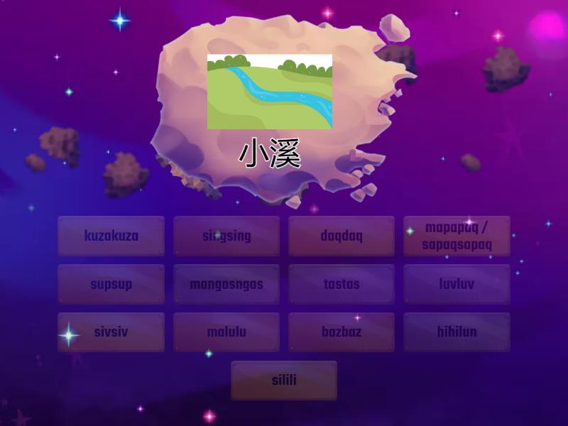 sivsiv - 小溪, luvluv - 風, singsing - 山腳下, daqdaq - 溫泉/舔, tastas - 瀑布, supsup - 吸, mapapaq / sapaqsapaq - 咀嚼, mangasngas - 啃,  bazbaz - 說, kuzakuza - 工作, hihilun - 蓋被子, malulu - 燒(如燒獵物的毛), silili - 模仿,