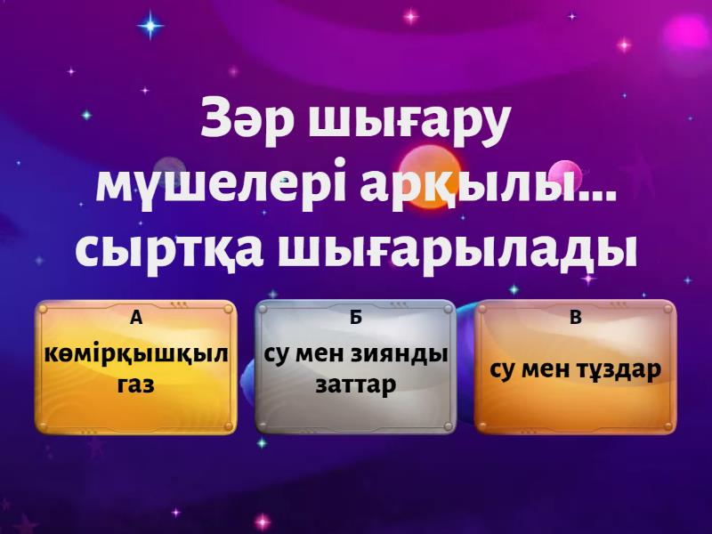 1) Зәр шығару мүшелері арқылы... сыртқа шығарылады a) көмірқышқыл газ b) су мен зиянды заттар c) су мен тұздар 2) ...-үрмебұршаққа ұқсас жұп мүше a) қуық b) несепағар c) бүйрек 3) Бүйректің атқаратын қызметі-... a) зәр шығару b) зәр жинау c) зәр түзу 4) Сыртқы ортадан келген әсерге жауап беретін мүшелер жүйесі a) тынысалу мүшелері b) зәр шығару мүшелері c) жүйке жүйесі 5) Сыртқы ортадан келген ақпаратты өңдеп, іс-әрекеттердің орындалуын басқаратын мүше- ... a) жұлын b) ми c) жүйкелер 6) Адам айналадағы заттар мен құбылыстарды қандай мүшелер арқылы қабылдайды? a) жұлын b) сезім мүшелері  c) жүйкелер 7) Сезім мүшелерін тап a) көру, қорқу b) айқайлау, есту c) дәм сезу, иіс сезу