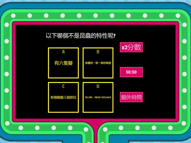 1) 以下哪個不是昆蟲的特性呢? a) 有六隻腳 b) 身體有一節一節的構造 c) 有頭胸腹三個部位 d) 若有翅膀,翅膀幾乎都長在腹部 2) 關於螳螂的特性,何者錯誤 a) 前腳呈鐮刀狀,便於捕捉食物 b) 身體有四隻腳 c) 具有翅膀可以飛翔 d) 有頭胸腹三個部位 3) 以下關於昆蟲的特性,下列何者錯誤? a) 昆蟲都用嘴巴發出聲音 b) 口器會因食物不同發展成不同的形狀 c) 蟋蟀的後腿強壯,擅長以跳躍移動 d) 獨角仙的外翅具有保護的功能 4) 在出外尋找昆蟲時,以下哪一項資訊不需記錄下來? a) 穿著 b) 時間 c) 地點 d) 昆蟲種類 5) 不完全變態的昆蟲和完全變態的昆蟲相比,缺乏了哪一種成長階段呢 a) 卵 b) 若蟲(幼蟲) c) 蛹 d) 成蟲 6) 看到死掉的昆蟲,怎麼處理會比較好呢? a) 拿去嚇同學 b) 吃掉 c) 不理它 d) 埋進土當中 7) 以下哪個事件不會造成昆蟲滅絕的危機呢? a) 設立自然保護區 b) 噴灑農藥 c) 重金屬汙染土地 d) 河川遭到工業廢水汙染