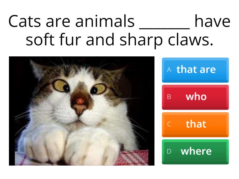 1) The car ________ has a scratch on the side is mine. a) which is b) which c) who d) where 2) September is a month _______ children go back to school. a) where b) that c) when d) which in 3) Italy is the country _______ the Renaissance began. a) where b) when c) which  d) that 4) An ambulance is a car_______takes people to hospital.  a) that is b) where c) that d) when 5) I like animals _______ are fluffy. a) where b) who c) which d) when 6) My dad works for the company _______ makes toys. a) which b) where c) who d) when 7) Cats are animals _______ have soft fur and sharp claws. a) that are b) who c) that d) where 8) The girl _______ lives next door plays the guitar. a) which b) that  c) when d) who 9) Harry Potter movies are films___________ tell us about the adventures of a young magician and his friends.  a) which b) that c) where d) who 10) Mrs. Trench is a woman________________ at our school as an art teacher.  a) who work b) who works c) which works d) where work 11) Is there a shop near my hospital__________ sells some special milk? a) where they b) who c) where d) which 12) The company __________ I work for is connected with medicines.  a) that b) who c) which d) where