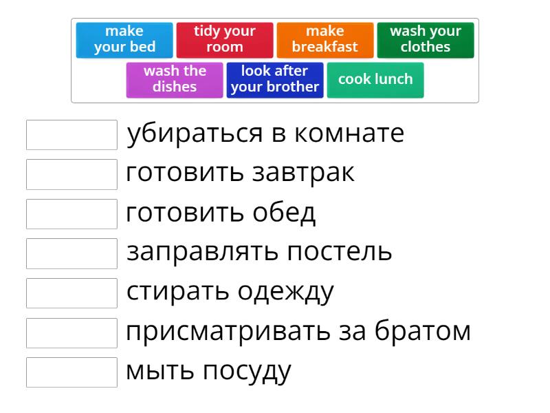 make breakfast - готовить завтрак, cook lunch - готовить обед, make your bed - заправлять постель, wash the dishes - мыть посуду, tidy your room - убираться в комнате, wash your clothes - стирать одежду, look after your brother - присматривать за братом,