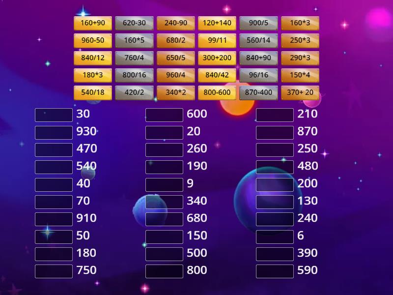 800/16 - 50, 900/5 - 180, 840/42 - 20, 680/2 - 340, 99/11 - 9, 96/16 - 6, 840/12 - 70, 760/4 - 190, 560/14 - 40, 650/5 - 130, 540/18 - 30, 420/2 - 210, 180*3 - 540, 150*4 - 600, 340*2 - 680, 160*5 - 800, 160*3 - 480, 960/4 - 240, 250*3 - 750, 290*3 - 870, 300+200 - 500, 370+ 20 - 390, 960-50 - 910, 800-600 - 200, 870-400 - 470, 840+90 - 930, 160+90 - 250, 620-30 - 590, 240-90 - 150, 120+140 - 260,