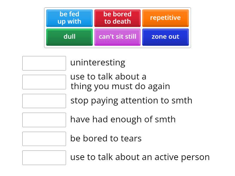 zone out - stop paying attention to smth, dull - uninteresting , be bored to death - be bored to tears, can't sit still - use to talk about an active person , be fed up with - have had enough of smth , repetitive - use to talk about a thing you must do again ,