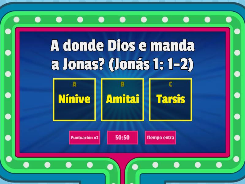 1) A donde Dios e manda a Jonas? (Jonás 1: 1-2) a) Nínive b) Amitai c) Tarsis 2) En que año Daniel interpreta el sueño de Nabucodonosor? (Daniel 2: 1) a) 2do año b) 1er año  c) 3ro año 3) ¿Cómo se llamaba el tercer sobrino de Abraham? ( Genesis 14: 12 ) a) Laban  b) ELIEZER c) LOT 4) ¿Cómo se llamaba el tercer hijo de Adán? ( Genesis 4: 25 ) a) Cainan b) Set c) Enós 5) ¿Por cuántos siclos de plata José fue vendido?  ( Genesis 37: 28 ) a) 10 b) 20 c) 30 6) ¿Cuál era el color de los cabellos de David? ( 1 Samuel 16: 12 ) a) negro b) castaño c) rubio 7) ¿Cuántas eran las provincias del reino de Asuero? ( Ester 1:1 ) a) 127 b) 107 c) 117 8) ¿Cuál es el color del cuarto caballo del apocalipsis? ( Apocalipsis 6:7-8 ) a) rojo  b) negro c) amarillo 9) ¿Cuál es el rey cuyo cuerpo fue fijado en el muro de una ciudad? ( 1 Samuel 31:8 ) a) Asa b) Saúl c) Jabín 10) ¿Cuál es el primer arbusto mencionado en la Biblia? ( Genesis 3:7 ) a) palmito b) higuera c) árbol de la ciencia del bien y el mal 11) Quien era el padre de Salomón a) Abraham b) Noé c) David 12) Qué es lo que permancece para siempre? a) La fe b) El amor c) La verdad 13) Cuál es la voluntad de Dios? a) Nuestra santificación b) Ser buenas personas c) Tener esperanza 14) Como se llamaba el hermano de Simón Pedro a) Judas b) Andrés c) Juan 15) A quién dijo Jesús yo soy el camino, la verdad y la vida? a) A Pedro b) A Juan c) A Tomás 16) A quién dijo Yavé antes que te formarse en el vientre te conocí? a) Natanel b) Ezequiel c) Jeremías 17) En que río fue bautizado Jesús? a) Eufrates b) Nilo c) Jordán 18) En que ciudad vivía Zaqueo? a) Jerusalén b) Jericó c) Belén 19) En cuantas piezas de plata vendió Judas a Jesús? a) 50 piezas b) 30 piezas c) 40 piezas 20) Quién escribión Cantar de los cantares? a) Jeremías b) David c) Salomón 21) Cuál es el primer libro del nuevo testamento? a) Marcos b) Mateo c) lucas 22) Que apóstol de Jesús era un recaudador de impuestos? a) Mateo b) Marcos c) Tomás 23) Cuál es el tercer libro de la biblia a) Números b) Exodo c) Levítico 24) Quien dijo al hombre tullido no tengo oro ni plat apero lo que tengo te lo doy? a) Juan b) Pedro c) Marcos