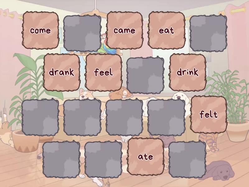drink - drank, eat - ate, come - came, feel - felt, go - went, have - had, make - made, meet - met, take - took,
