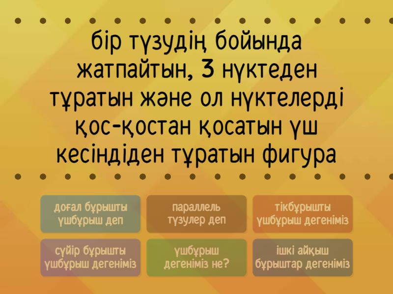 үшбұрыш дегеніміз не? - бір түзудің бойында жатпайтын, 3 нүктеден тұратын және ол нүктелерді қос-қостан қосатын үш кесіндіден тұратын фигура, сүйір бұрышты үшбұрыш дегеніміз - барлық бұрыштары сүйір сүйір болатын үшбұрыш, тікбұрышты үшбұрыш дегеніміз - үшбұрыштың бір бұрышы тік болса, доғал бұрышты үшбұрыш деп - үшбұрыштың бір бұрышы доғал болса, параллель түзулер деп - жазықтықтағы екі түзу қиылыспаса,ортақ нүктелері болмаса , ішкі айқыш бұрыштар дегеніміз - параллель түзуді үшінші түзу қиса, сол түзудің айқасқан бұрыштары,