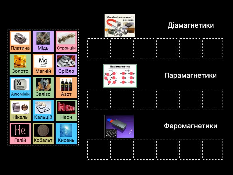 Діамагнетики: Гелій, Неон, Мідь, Золото, Срібло, Азот, Парамагнетики: Кисень, Платина, Магній, Стронцій, Алюміній, Кальцій, Феромагнетики: Залізо, Нікель, Кобальт,