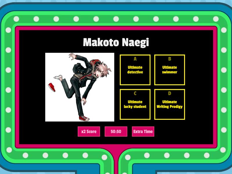 1) Makoto Naegi a) Ultimate detective b) Ultimate swimmer c) Ultimate lucky student d) Ultimate Writing Prodigy 2) Kyoko Kirigiri a) Ultimate baseball star b) Ultimate detective c) Ultimate biker gang leader d) Ultimate affluent progeny 3) Sayaka Maizono a) Ultimate lucky student b) Ultimate Writing Prodigy c) Ultimate moral compass d) Ultimate pop sensation 4) Yasuhiro Hagakure a) Ultimate biker gang leader b) Ultimate fortune teller c) Ultimate gambler d) Ultimate Fanfic Creator 5) Celestia Ludenberg a) Ultimate gambler b) Ultimate affluent progeny c) Ultimate fanfic creator d) Ultimate moral compass 6) Hifumi Yamada a) Ultimate moral compass b) Ultimate baseball star c) Ultimate biker gang leader d) Ultimate fanfic creator 7) Toko fukawa a) Ultimate Writing Prodigy b) Ultimate detective c) Ultimate swimmer d) Ultimate Martial Artist 8) Aoi Asahina a) Ultimate detective b) Ultimate biker gang leader c) Ultimate swimmer d) Ultimate fanfic creator 9) Sakura Ogami a) Ultimate Martial Artist b) Ultimate fortune teller c) Ultimate gambler d) Ultimate swimmer 10) Byakuya Togami a) Ultimate detective b) Ultimate lucky student c) Ultimate affluent progeny d) Ultimate Writing Prodigy 11) Leon Kuwata a) Ultimate biker gang leader b) Ultimate swimmer c) Ultimate moral compass d) Ultimate baseball star 12) Mondo Owada a) Ultimate swimmer b) Ultimate biker gang leader c) Ultimate Martial Artist d) Ultimate moral compass 13) Kyotaka Ishimaru a) Ultimate moral compass b) Ultimate Writing Prodigy c) Ultimate biker gang leader d) Ultimate gambler 14) Junko Enoshima a) Ultimate fashionista b) Ultimate swimmer c) Ultimate detective d) Ultimate biker gang leader 15) Chihiro Fujisaki a) Ultimate detective b) Ultimate programmer c) Ultimate affluent progeny d) Ultimate writing prodigy 16) Mukuro Ikusaba a) Ultimate pop sensation b) Ultimate swimmer c) Ultimate detective d) Ultimate Soldier