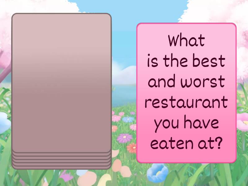 : How long have you known your best friend?, What kind of movies have you been watching recently? , What is the best and worst restaurant you have eaten at?, What have you been doing with your free time recently?, Have you ever sent a message to the wrong person?, What kind of sports have you been doing recently?, Have you ever eaten something unusual?,