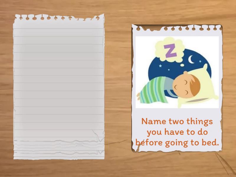 Name two things you have to do to stay healthy. , Name two things you have to do on online classes. , Name two things you have to do before going to bed. , Name two things you don't have to do when you're on holiday. , Name something you don't have to do next week., Name something you don't have to do in summer, Name 3 things you have to do every day, Name 3 things your mum has to do every week.