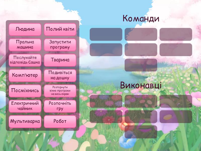 Команди: Запустити програму, Розпочніть гру, Посміхнись, Розгорнути вікно програми на весь екран, Послухайте відповідь Сашка, Полий квіти, Подивіться на дошку, Виконавці: Тварина, Людина , Робот, Комп'ютер, Пральна машина, Електричний чайник, Мультиварка,