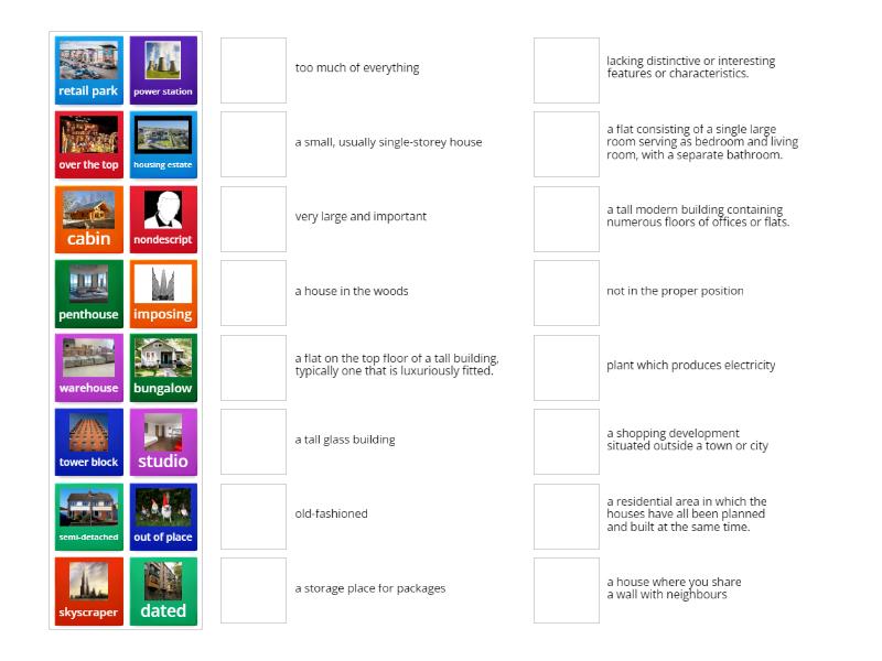 cabin - a house in the woods, skyscraper - a tall glass building, power station - plant which produces electricity , retail park - a shopping development situated outside a town or city, tower block - a tall modern building containing numerous floors of offices or flats., penthouse - a flat on the top floor of a tall building, typically one that is luxuriously fitted., studio - a flat consisting of a single large room serving as bedroom and living room, with a separate bathroom., bungalow - a small, usually single-storey house, semi-detached - a house where you share a wall with neighbours, warehouse - a storage place for packages, housing estate - a residential area in which the houses have all been planned and built at the same time., nondescript - lacking distinctive or interesting features or characteristics., dated - old-fashioned, out of place - not in the proper position, imposing - very large and important, over the top - too much of everything,