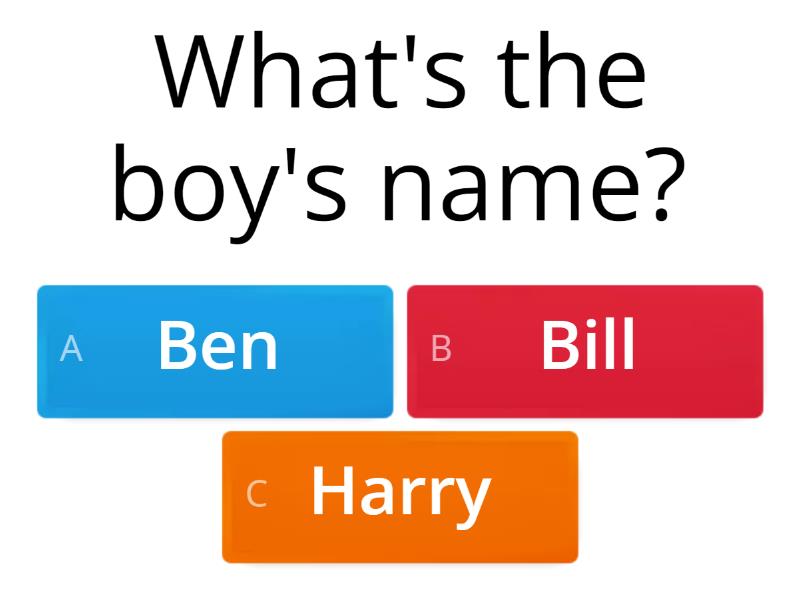 1) What's the boy's name? a) Ben b) Bill c) Harry 2) How many people are there in Ben's family? a) Grandpa, grandma, mother, father b) Grandpa, grandma, mother, father, uncle, aunt c) Grandpa, grandma, mother, uncle 3) Does Ben have a pet? a) Yes, he has cat b) Yes, he has dog c) No, he hasn't 4) What do uncle and aunt like to do? a) Swimming b) Jumping c) Dancing 5) What does Ben like doing? a) He likes swimming b) He likes dancing c) He likes playing