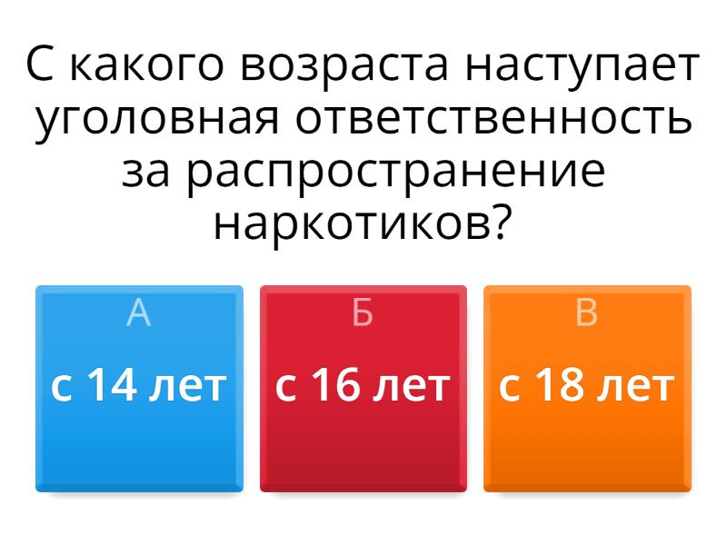 1) С какого возраста наступает уголовная ответственность за распространение наркотиков? a) с 14 лет b) с 16 лет c) с 18 лет 2) Какой наркотик относится к тяжелым и вызывает мгновенное привыкание? a) гашиш b) героин c) марихуана 3) Незнание закона не освобождает от a) заключения b) наказания c) ответственности 4) Что означает слово "наркомания"? a) удовольствие b) оцепенение c) эйфория 5) Какой болезнью может заразиться наркоман при использовании нестерильного шприца? a) СПИД b) пневмония c) грипп 6) Как влияет употребление наркотиков на работу сердца? a) замедляет работу сердца b) не влияет c) заставляет биться учащенно 7) На что оказывают влияние наркотики? a) на зрение b) на творческие способности c) на психику 8) Чем опасны синтетические наркотики? a) вызывают галлюцинации b) приводят в замешательство c) приводят к дезориентации 9) В каком возрасте человек быстрее попадает под наркотическую зависимость? a) 30 лет b) 15 лет c) 40 лет 10) Наркомания - это болезнь, у которой отсутствует одна стадия a) инкубационный период b) выздоровление c) агония