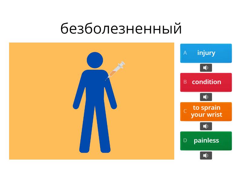 1) безболезненный a) injury b) condition c) to sprain your wrist d) painless 2) вызывать a) cure b) treatment c) to sprain your wrist d) to cause 3) состояние a) condition b) to injure c) warning  d) treatment 4) лечить a) injury b) to trip over c) painless d) cure 5) лечение a) to sprain your wrist b) to trip over c) treatment d) to bleed 6) травма a) to sprain your ankle b) bruise c) to slip over  d) injury 7) пораниться a) to sprain your wrist b) cure c) to slip over  d) to injure 8) спокнуться a) to trip over b) treatment c) to sprain your wrist d) to bleed 9) поскользнуться a) condition b) to slip over  c) burn d) to injure 10) кровоточить a) painless b) bruise c) to bleed d) to slip over  11) растянуть лодыжку a) to slip over  b) injury c) to sprain your ankle d) condition 12)  растянуть запястье a) to sprain your wrist b) treatment c) to slip over  d) bruise 13)  синяк a) cure b) burn c) bruise d) condition 14) ожог a) burn b) bruise c) to slip over  d) warning  15) предупреждение a) to slip over  b) bruise c) warning  d) to sprain your wrist 16)  генетическое нарушение a) to bleed b) to cause c) to injure d) genetic disorder 17) болезненный a) painful b) cure c) to bleed d) to sprain your ankle