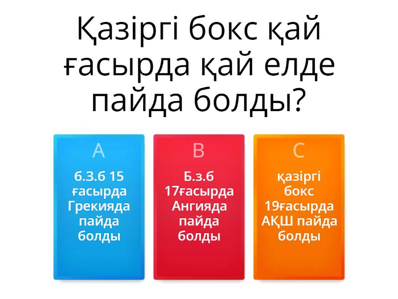 1) Қазіргі бокс қай ғасырда қай елде пайда болды? a) б.З.б 15 ғасырда Грекияда пайда болды b) Б.з.б 17ғасырда Ангияда пайда болды c) қазіргі бокс 19ғасырда АҚШ пайда болды 2) қысқа қашықтық неше метрді құрайды? a) 500м b) 200м c) 100м 3) Футболдағы ең алғашқы әлем чемпиянатын қай құрама жеңіп алды? a) Аргентина b) Италия c) Уругвай d) Испания 4) Баскетболды кім ойлап тапты? a) Нильс Смит b) Улиян Морган c) Д.Блоутон d) Маркуз куинзбери