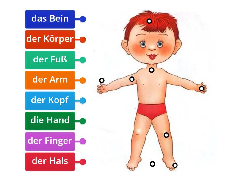 der Kopf, der Hals, der Arm, die Hand, der Finger, das Bein, der Fuß, der Körper.