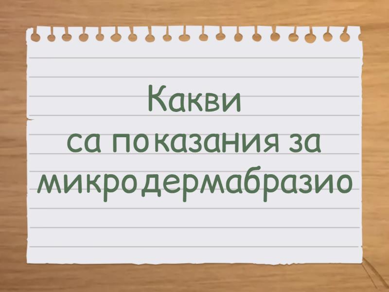 определение за фримация - Метод, чрез който се осъществява отстраняване на мъртвия слой клетки, чрез механично въздействие ( четка, ултразвук) , С каква форма са електродите при директна апликация на д ' Арсонвал? - електродите имат гладка и плоска повърхност, които позволяват бавно и нежно движение върху третирани те зони. , Какво е определението за вапоризация? - Водна процедура, при която охладена пара под налягане се насочва към лицето под формата на струя , Какво е определението за йонофореза? - Метод, чрез който се въвеждат различни лекарствени средства в кожата с помощта на галваничен ток, Какви са показания за микродермабразио - профилактика и намаляване на видимостта на финни бръчки, повлияване на себорейна кожа и широки пори, хиперпигментни петна, белези след акне, стрии, Кога не се прилага вапоризация? - хипертония, астма, базедова болест, силна форма на розацеята и купероза, гнойни и възпалителни заболявания на кожата , От какво се почиства лицето с помощта на ултразвук? - дълбоките замърсявания, мъртви рогови клетки, комедоните и излишното омазняване , Колко е времетраенето на вапоризациятс при мазна и акнеична кожа? - 25 - 30 минути , Какви са показанията за пилинг с ултразвук? - Мазна и смесен тип кожа, акне, разширени пори, пигментни петна, дехидратиран кожа с белези на стареене, Колко сантиметра е дистанцията между кожата и пулверизатора на вапозона при мазна кожа? - 15 сантиметра ,
