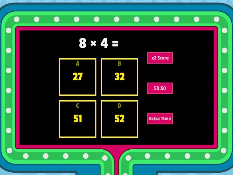 1) 8 × 4 = a) 27 b) 32 c) 51 d) 52 2) 8 × 3 = a) 14 b) 24 c) 26 d) 43 3) 8 × 10 = a) 78 b) 80 c) 96 d) 99 4) 8 × 11 = a) 84 b) 88 c) 112 d) 120 5) 8 × 8 = a) 48 b) 59 c) 64 d) 71 6) 8 × 6 = a) 48 b) 65 c) 80 d) 85 7) 8 × 7 = a) 16 b) 56 c) 81 d) 88 8) 8 × 5 = a) 23 b) 37 c) 40 d) 66 9) 8 × 1 = a) 8 b) 33 c) 34 d) 49 10) 8 × 9 = a) 17 b) 19 c) 50 d) 72 11) 8 x 12 = a) 96 b) 72 c) 58 12) 8 x 2 = a) 14 b) 17 c) 16