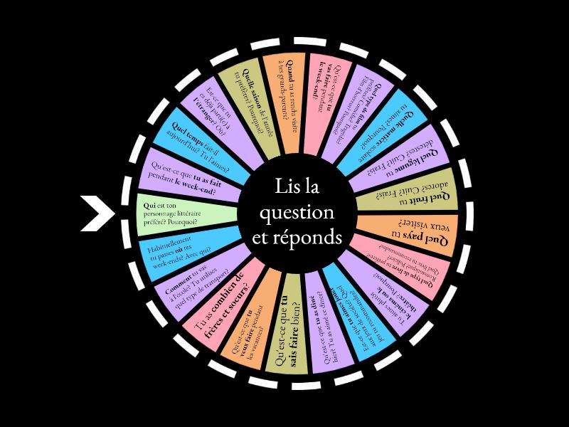 Qu'est-ce que tu as fait pendant le week-end?, Quel temps fait-il aujourd'hui? Tu l'aimes?, Est-ce que tu es déjà parti(e) à l'étranger? Où?, Quelle saison de l'année tu préfères? Pourquoi?, Quand tu as rendu visite à tes grands-parents?, Qu'est-ce que tu vas faire pendant le week-end?, Quel type de film tu préfères? Comédie? Tragédie? Film d'horreur? Pourquoi?, Quelle matière scolaire tu aimes? Pourquoi?, Quel légume tu détestes? Cuit? Frais?, Quel fruit tu adores? Cuit? Frais?, Quel pays tu veux visiter?, Quel type de livre tu préfères? Romantique? Policier? Quel livre tu recommandes?, Tu aimes plutôt le cinéma ou le théâtre? Pourquoi?, Est-ce que tu aimes jouer aux jeux de société? Quel jeu tu recommandes?, Qu'est-ce que tu as dîné hier? Tu as aimé ce dîner?, Qu'est-ce que tu sais faire bien?, Qu'est-ce que tu veux faire pendant les vacances?, Tu as combien de frères et soeurs?, Comment tu vas à l'école? Tu utilises quel type de transport?, Habituellement tu passes où tes week-ends? Avec qui?, Qui est ton personnage littéraire préféré? Pourquoi?.