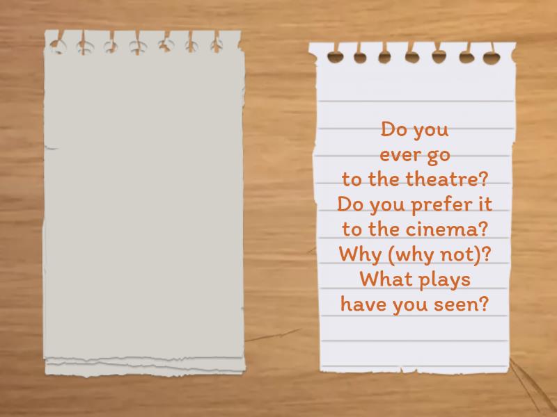 What actors do you particularly enjoy watching? Why do you like them? Which performances in particular?, What's one of the best films you have seen recently? Why did you like it so much?, Do you ever go to the theatre? Do you prefer it to the cinema? Why (why not)? What plays have you seen?, Have you ever acted in a play or film? Have you ever worked on a film set? How was it? Did you have stage fright?.