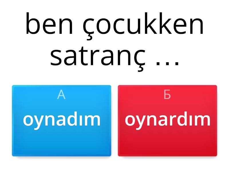 1) ben çocukken satranç … a) oynadım b) oynardım 2) O sabahları süt … a) içiyor b) içer c) içti 3) sen matematik … a) sevmezsin b) sevmedim 4) siz daha önce gözlük… a) takmadınız b) takmazsınız