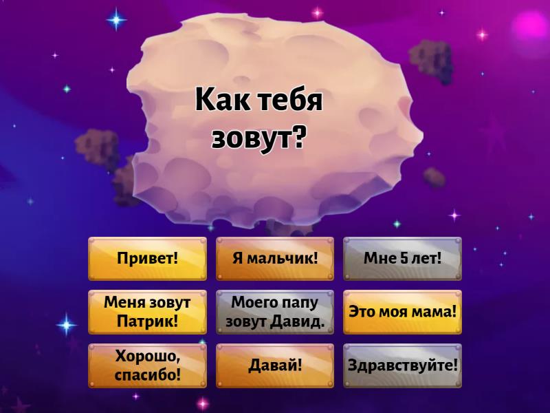Меня зовут Патрик! - Как тебя зовут?, Мне 5 лет! - Сколько тебе лет?, Давай! - Давай дружить?, Это моя мама! - Кто это?, Моего папу зовут Давид. - Как зовут твоего папу?, Хорошо, спасибо! - Как дела?, Привет! - Привет!, Здравствуйте! - Здравствуйте! , Я мальчик! - Кто ты?,