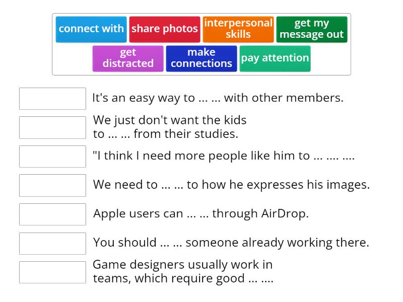get distracted - We just don't want the kids to ... ... from their studies., connect with - You should ... ... someone already working there., pay attention - We need to ... ... to how he expresses his images., share photos - Apple users can ... ... through AirDrop., interpersonal skills - Game designers usually work in teams, which require good ... ...., get my message out - "I think I need more people like him to ... .... ...., make connections - It's an easy way to ... ... with other members.,