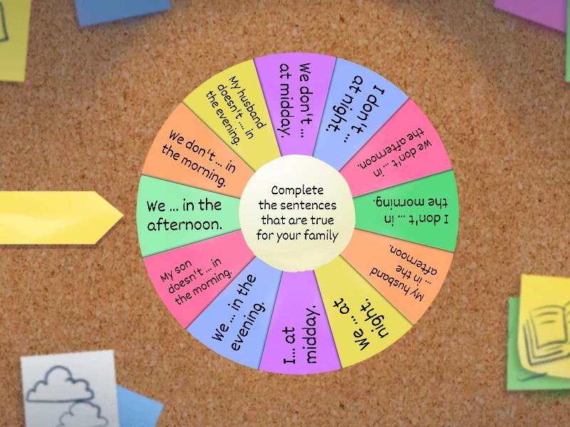 1) We don't ... in the morning. 2) My husband doesn't .... in the evening. 3) We don't ... at midday. 4) I don't ... at night. 5) We don't ... in the afternoon. 6) I don't ... in the morning. 7) My husband ... in the afternoon. 8) We ... at night. 9) I... at midday. 10) We ... in the evening. 11) My son doesn't ... in the morning. 12) We ... in the afternoon.