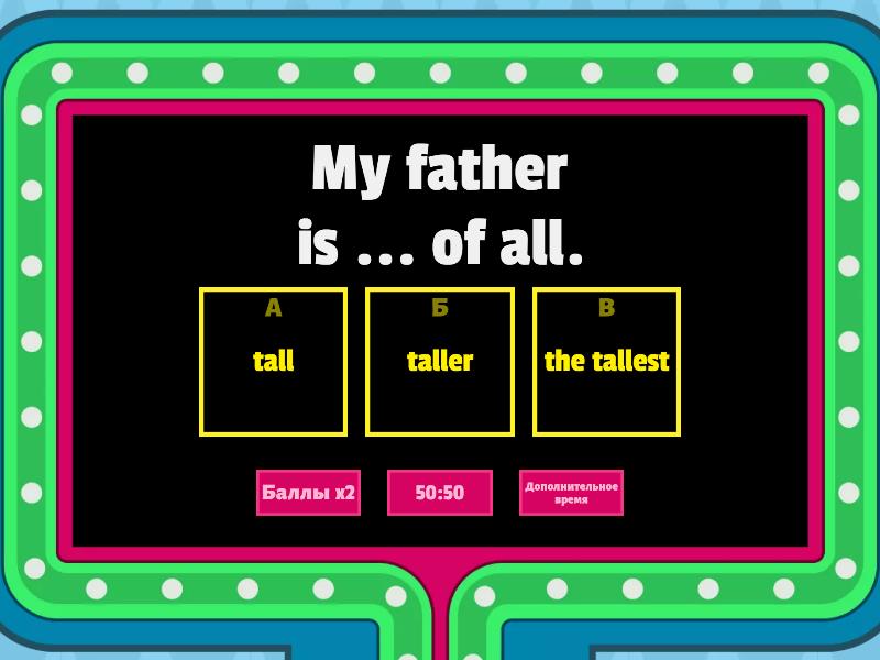 1) My father is ... of all. a) tall b) taller c) the tallest 2) I'm ... girl in class. a) the cleverest b) cleverer c) clever 3) Your bag is ... than mine. a) big b) the biggest c) bigger 4) He is ... in our team. a) the short b) the shorter c) the shortest 5) I've got a 5! It's ... mark! a) the goodest b) the best c) good 6) She is ... girl I've ever seen! a) a beautiful b) the most beautiful c) more beautiful 7) My puppy is ill. It's ... of my life. a) worse b) the worst c) the baddest 8) The Harry Potter book is ... than the Robin Hood book. a) interesting b) most interesting c) more interesting 9) My house is ... from the city centre than yours. a) noisier b) more noisy c) more noisier 10) I'm 9, but my brother is 7. He is ... . a) young b) the most young c) younger
