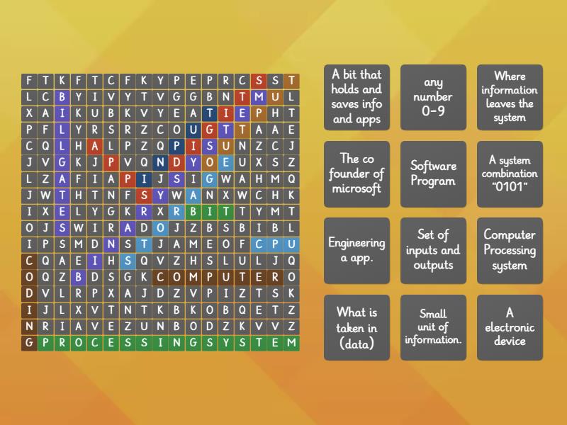 Bit - Small unit of information., Binary System - A system combination "0101", Digits - any number 0-9, CPU - Computer Processing system, Computer - A electronic device, Input - What is taken in (data), Output - Where information leaves the system, Processing System - Set of inputs and outputs, Bill Gates - The co founder of microsoft, Apps - Software Program, Storage - A bit that holds and saves info and apps, Coding - Engineering a app.,
