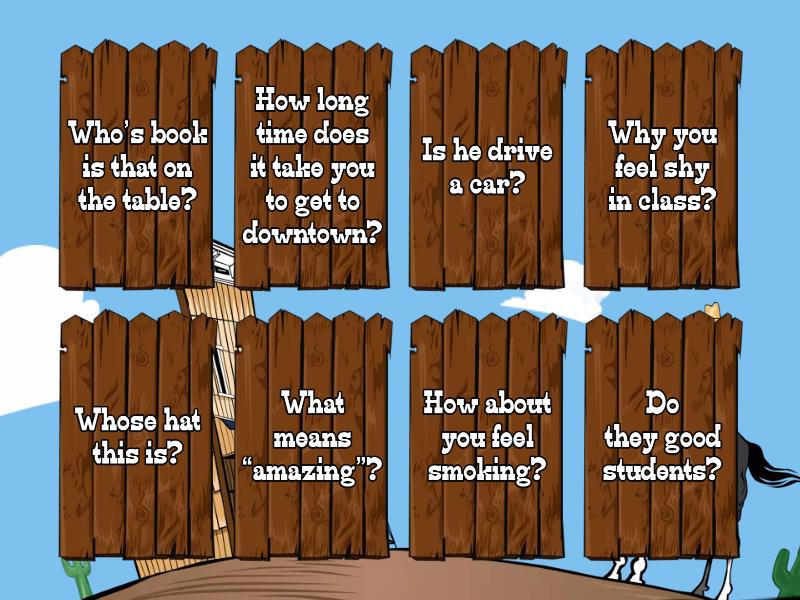 Do they good students? - Are they good students?, Who’s book is that on the table? - Whose book is that on the table?, What means “amazing”? - What does "amazing" mean?, Is he drive a car? - Is he driving a car?, Why you feel shy in class? - Why do you feel shy in class?, Whose hat this is? - Whose hat is this?, How long time does it take you to get to downtown? - How long does it take you to get to downtown?, How about you feel smoking? - How do you feel about smoking?,