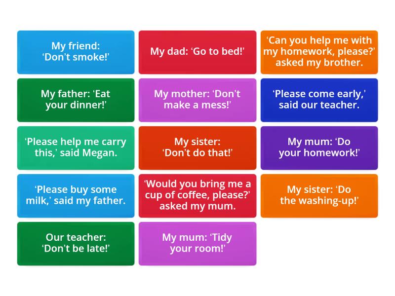 ‘Please help me carry this,’ said Megan. - Megan asked me to help her carry this. , ‘Please come early,’ said our teacher. - Our teacher asked us to come early. , ‘Please buy some milk,’ said my father. - My father asked me to buy some milk. , ‘Can you help me with my homework, please?’ asked my brother. - My brother asked me to help him with his homework. , ‘Would you bring me a cup of coffee, please?’ asked my mum. - My mum asked me to bring her a cup of coffee. , My mum: ‘Do your homework!’ - My mum told me to do my homework. , My dad: ‘Go to bed!’ - My dad told me to go to bed. , Our teacher: ‘Don’t be late!’ - Our teacher told us not to be late. , My friend: ‘Don’t smoke!’ - My friend told me not to smoke. , My mum: ‘Tidy your room!’ - My mum told me to tidy my room. , My sister: ‘Don’t do that!’ - My sister told me not to do that. , My father: ‘Eat your dinner!’ - My father told me to eat my dinner. , My mother: ‘Don’t make a mess!’ - My mother told me not to make a mess. , My sister: ‘Do the washing-up!’ - My sister told me to do the washing-up.,