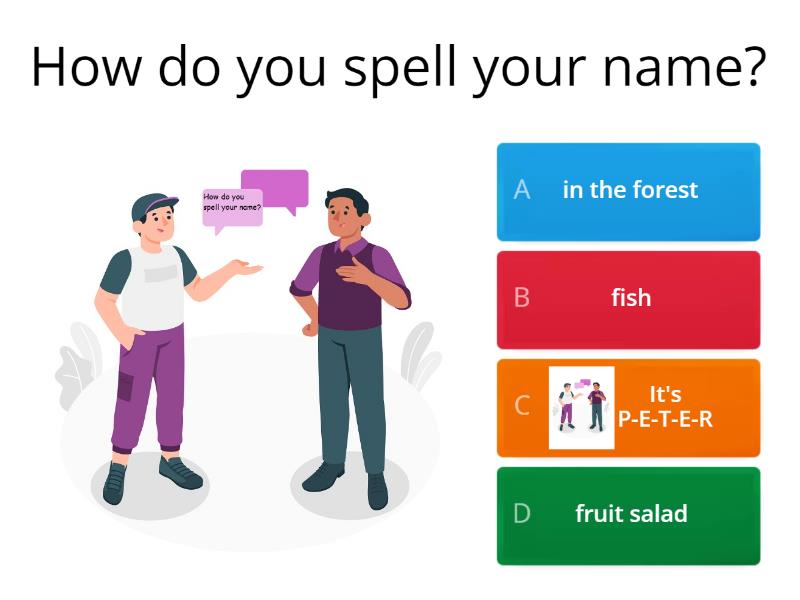 1) How do you spell your name? a) in the forest b) fish c) It's P-E-T-E-R d) fruit salad 2) in the _______ a) candies b) forest c) It's P-E-T-E-R d) fruit salad 3) What's your favourite _______? a) fish b) food c) pizza d) candies 4) My favourite food is _______. a) candies b) cucumber sandwich c) orange marmalade d) salad
