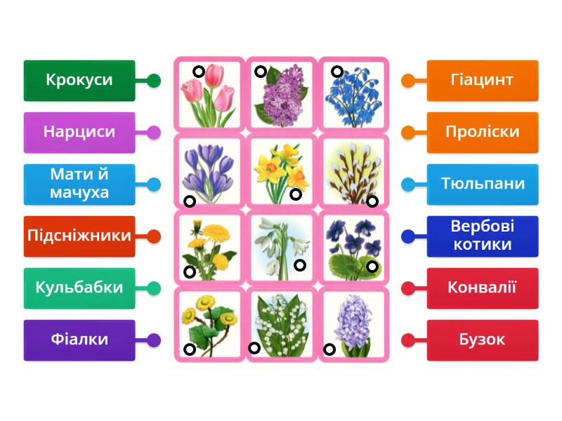 Тюльпани, Бузок, Проліски , Крокуси, Нарциси, Вербові котики, Кульбабки , Підсніжники, Фіалки , Мати й мачуха, Конвалії , Гіацинт.