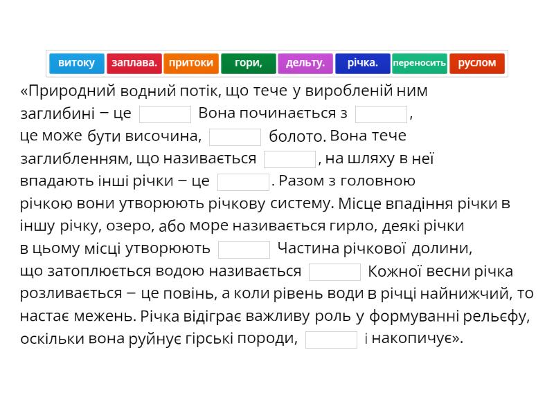 «Природний водний потік, що тече у виробленій ним заглибині – це ____ Вона починається з ____, це може бути височина, ____ болото. Вона тече заглибленням, що називається ____, на шляху в неї впадають інші річки – це ____. Разом з головною річкою вони утворюють річкову систему. Місце впадіння річки в іншу річку, озеро, або море називається гирло, деякі річки в цьому місці утворюють ____ Частина річкової долини, що затоплюється водою називається ____ Кожної весни річка розливається – це повінь, а коли рівень води в річці найнижчий, то настає межень. Річка відіграє важливу роль у формуванні рельєфу, оскільки вона руйнує гірські породи, ____ і накопичує».