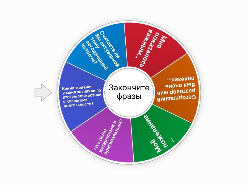 1) Считаете ли Вы актуальной тему сегодняшней встречи? 2) Мне показалось важным... 3) Сегодняшний разговор мне был очень полезен... 4) Моё пожелание ... 5) Что было интересным и оригинальным? 6) Какие желания у меня возникли по итогам совместной с коллегами деятельности?