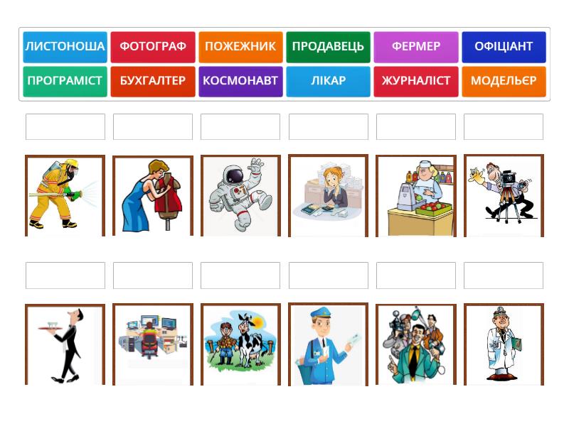 ЛІКАР, ЛИСТОНОША, ПРОДАВЕЦЬ , ПРОГРАМІСТ , ОФІЦІАНТ , ФЕРМЕР, МОДЕЛЬЄР , КОСМОНАВТ , ЖУРНАЛІСТ , ПОЖЕЖНИК, БУХГАЛТЕР , ФОТОГРАФ ,