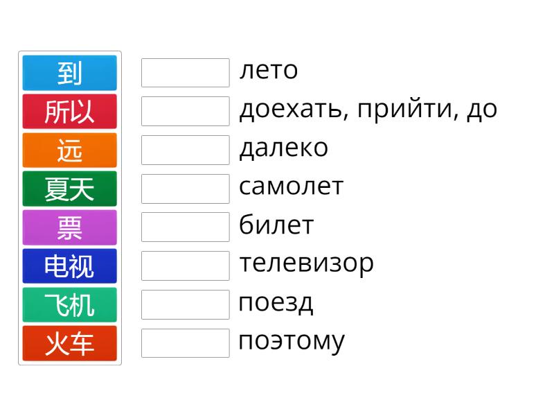 电视 - телевизор, 夏天 - лето, 火车 - поезд, 远 - далеко, 所以 - поэтому, 飞机 - самолет, 到 - доехать, прийти, до, 票 - билет ,