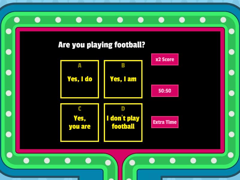 1) Are you playing football? a)  Yes, I do b) Yes, I am c) Yes, you are d) I don’t play football 2) I do my homework every day a) Pres. Simple b) Pres. Continous c) Present 3) Rice a) Contable b) Uncontable 4) Paco is __________ in the world a) The most intelligent b) More intelligent than… c) Intelligent d) Intelligenter e) The Interligentest 5) Se escribe -es en los verbos terminados en… a) cs b) x c) z d) ech 6) Present simple affirmative: S + V + C a) True b) False 7) Present simple negative: S + V + DON’T / DOESN’T + C a) True b) False 8) Present simple: Have ?: HAVE + S + GOT + V + ? a) False b) True 9) Do you like eats spaguetti? a) False b) True 10) Past Simple Verb Have a) Had b) Has c) Haved