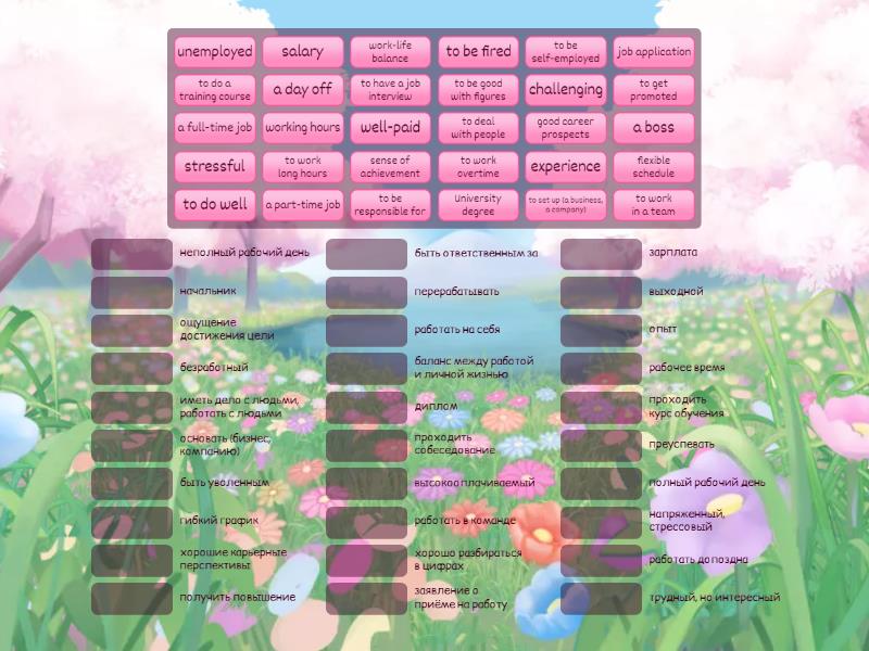 to be fired - быть уволенным, to get promoted - получить повышение, unemployed - безработный, a boss - начальник, to have a job interview - проходить собеседование, a part-time job - неполный рабочий день, a full-time job - полный рабочий день, working hours - рабочее время, University degree - диплом, experience - опыт, to be self-employed - работать на себя, to set up (a business, a company) - основать (бизнес, компанию), to do well - преуспевать, to work overtime - перерабатывать, to do a training course - проходить курс обучения, to be responsible for - быть ответственным за, a day off - выходной, job application - заявление о приёме на работу, salary - зарплата, challenging - трудный, но интересный, work-life balance - баланс между работой и личной жизнью, sense of achievement - ощущение достижения цели, stressful - напряженный, стрессовый, well-paid - высокооплачиваемый, good career prospects - хорошие карьерные перспективы, to work long hours - работать допоздна, to work in a team - работать в команде, to deal with people - иметь дело с людьми, работать с людьми, to be good with figures - хорошо разбираться в цифрах, flexible schedule - гибкий график,