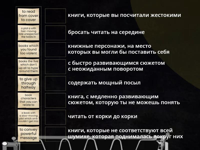 a plot a with fast-moving tale unexpected the twists in - с быстро развивающимся сюжетом с неожиданным поворотом, to read from cover to cover - читать от корки до корки, to give up through halfway  - бросать читать на середине, to convey powerful message - содержать мощный посыл, a book with a slow-moving plot which smb couldn’t get into - книга, с медленно развивающим сюжетом, которую  ты не можешь понять, books the live which don’t up all to hype around them  - книги, которые не соответствуют всей шумихе, которая поднималась вокруг них, books which you found too violent  - книги, которые вы посчитали жестокими, book characters that you can relate to - книжные персонажи, на место которых вы могли бы поставить себя ,